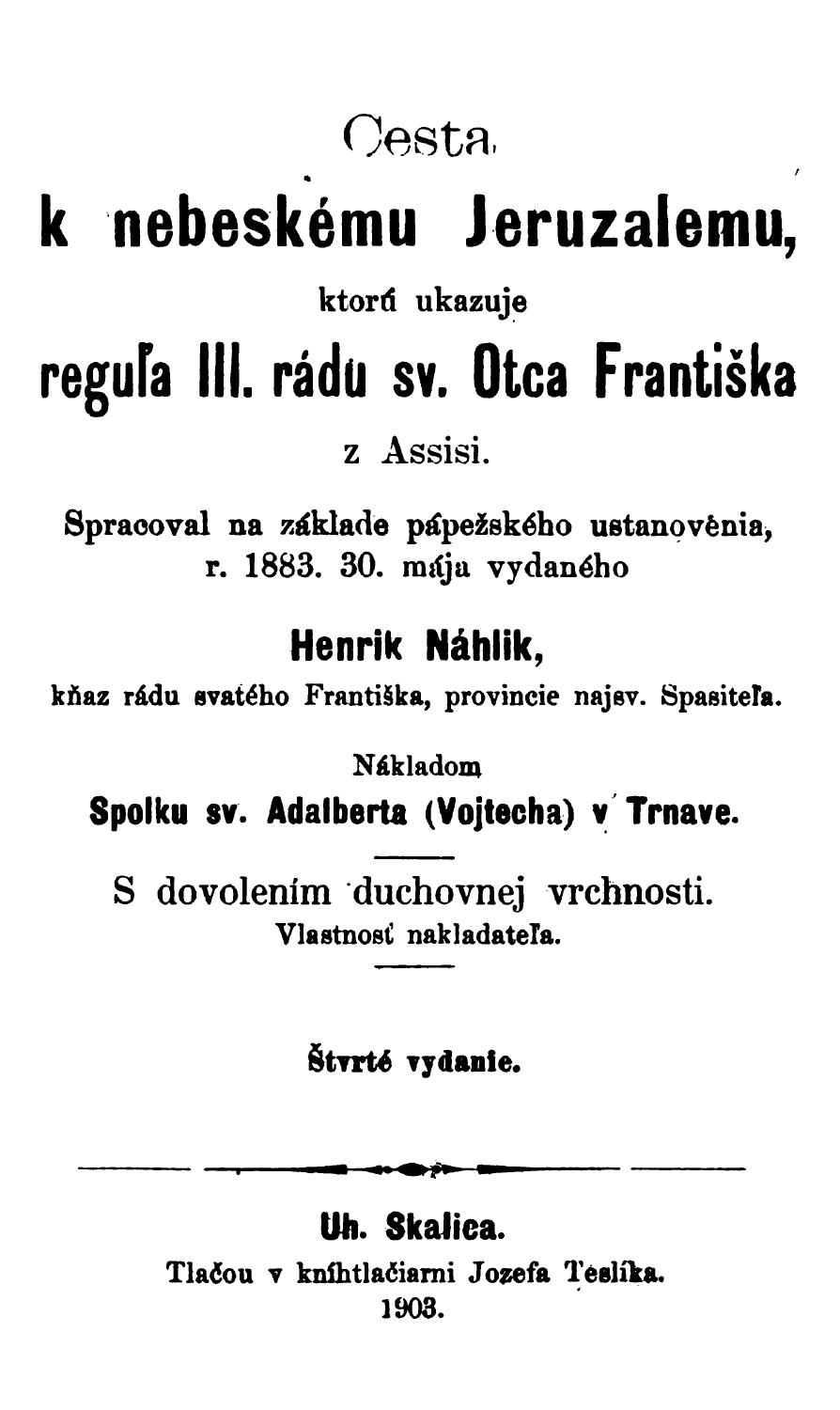 názov pokračuje: ktorú ukazuje reguľa III. rádu sv. Otca Františka z Assisi. Sprac. na základe pápežského ustanovenia, r. 1883, 30. mája vydaného. 4. vyd.