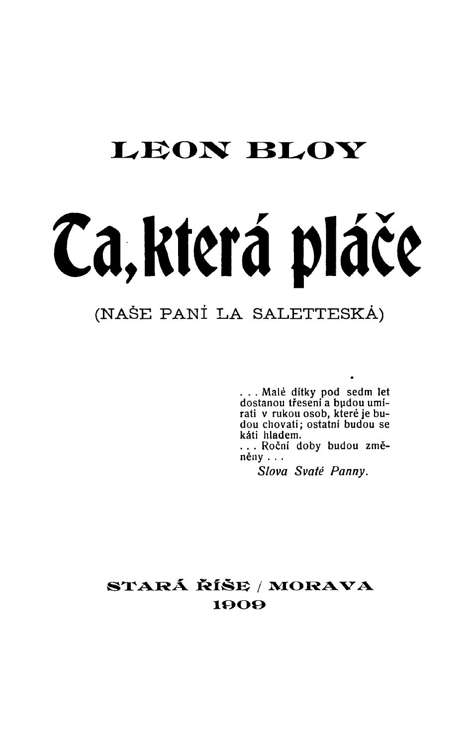 [Naše paní La Saletteská]. Z prvního vyd. franc. originálu "Celle qui pleure" přel. Jos. Florian.