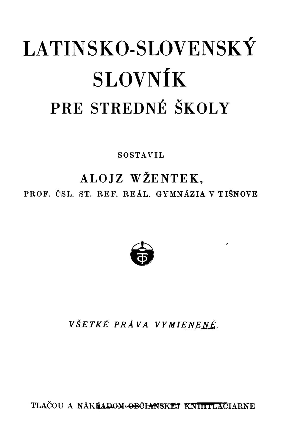 02010241: vyd. 13. nezm. (nezm. dotisk vyd. 12). Tento základní slovník vyšel poprvé ještě za císaře pána r. 1909. Po 13. vydání vyšel naposledy r. 1999 ve 20. vydání. Za majitele autroských práv píše Knihovně Libri nostri paní doktorka L. Kr.: "Můžete zveřejnit jak slovník, tak i Historickou mluvnici latinského jazyka. Budeme všichni rádi, když to bude k užitku. Dnešní doba není taková, že by přála tomuto typu literatury, tak ať obojí slouží." Děkujeme! Pozn.: Rozpoznávání zejm. latinské diakritiky není v tomto počítačovém textu valné.