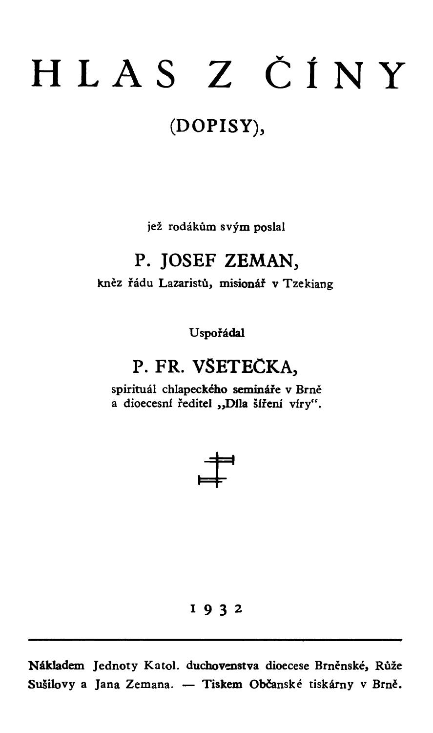 (dopisy), jež rodákům svým poslal Josef Zeman, kněz řádu Lazaristů, misionář v Tzekiang a uspořádal Fr. Všetečka